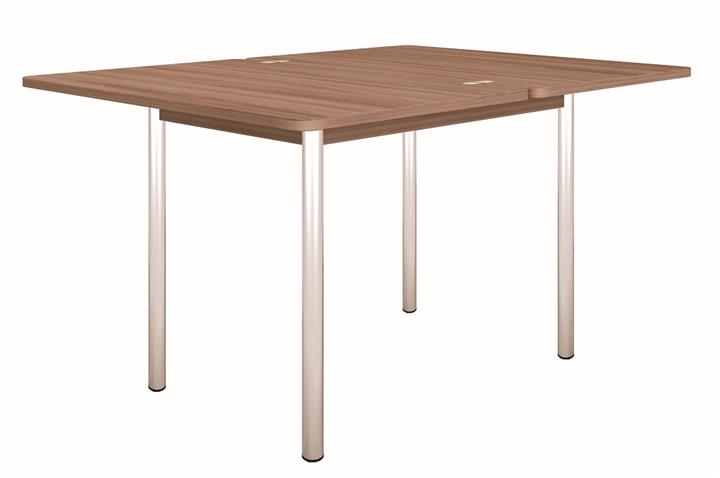 «Орфей 1.1» - обеденный стол с возможностью увеличения столешницы в 2 раза. Вместительную нишу для хранения кухонных мелочей оценит любая хозяйка, а металлические стоевые подчеркнут современный стиль обеденного стола.