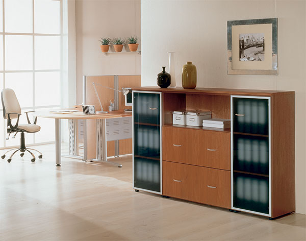 Тумбы различного назначения, приставные и подкатные, имеют крышки из МДФ с фасонным профилем и снабжены замками. Мобильные стеллажи и тумбы с дверцами-жалюзи улучшают эргономику рабочего места.